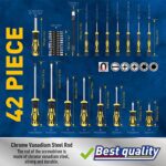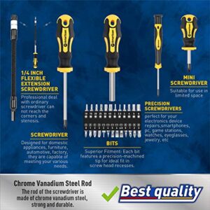 42-piece magnetic screwdriver set consists of 8 Conventional screwdriver,6 Precision Screwdriver and 25 screwdriver bits.There are 5 different screw types including Phillips, Slotted, Torx, Hex and Pozidriv,