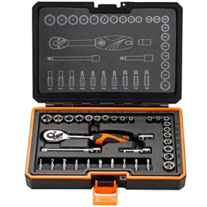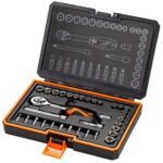 COMBINED METRIC SAE SOCKET SET: A 35 piece set of sockets in the most convenient sizes you’ll ever need. Metric – 4, 5, 6, 7, 8, 9, 10, 11, 12, 13mm. SAE – 5/32″, 3/16″, 7/32″, 1/4″, 9/32″, 5/16″, 11/32″, 3/8″, 7/16″, 1/2″. Bits – Torx T10, T15, T20, Slotted 3,4,5mm, Phillips PH0,PH1,PH2,PH3